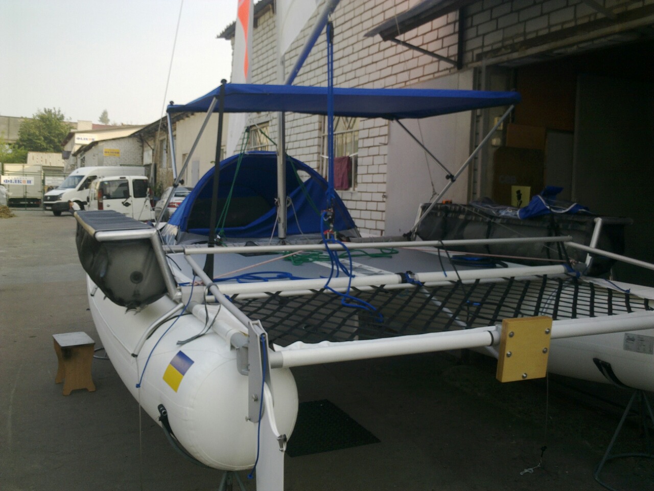 Also outboard engines with a power up to 4.0 hp can be installed on this catamaran via an additional motor bracket attached to the aft beam.